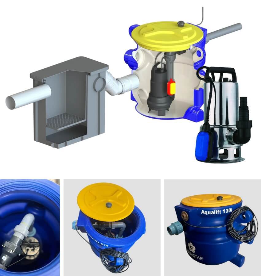 A Estação Elevatoria Aqualift 230L, uma elevatória compacta que atende de 4 a 5 casas. Equipamento configurável, de baixo custo e rápida instalação, pode ser aplicado com 1 ou 2 bombas sendo a solução definitiva e eficiente da soleira negativa.