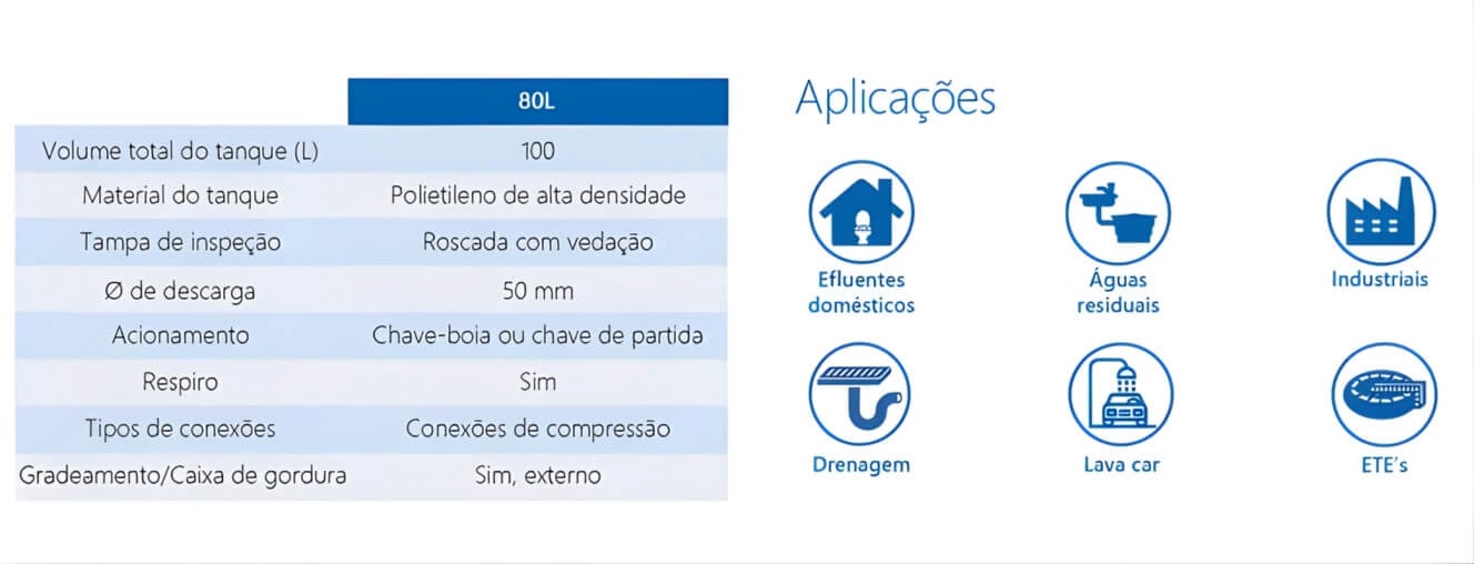 - Acionamento Automático: Sensores integrados que ligam e desligam a bomba de acordo com o nível da água residual no reservatório, garantindo operação sem intervenção manual.